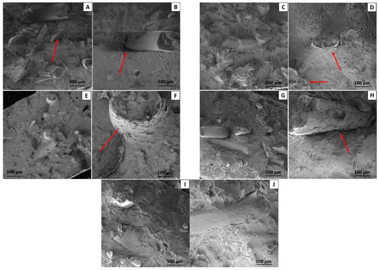 Figure 12A,B shows the biocomposites with 30% babassu fiber. As seen in the specialized literature [], natural fibers present a low adhesion with conventional thermoplastics due to their polar nature. Thus, it is possible to notice a high number of voids on the surface, as indicated by the arrow in Figure 12A. Fiber pull-out and fiber agglomerates were also observed on the surface, indicating poor filler dispersion and low fiber/matrix adhesion. Figure 12B shows that the fiber presents a well-defined interface concerning the biopolyethylene matrix, which is characteristic of the low adhesion mentioned among the present phases.