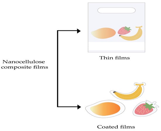 Food packaging is a crucial part of storage, sales, and transportation in the food industry, protecting food from oxygen, water, dust, and microorganisms, and maintaining the quality, safety, and freshness of food products. Ahankari et al. [] stated that biopolymers have poor barrier, thermal, and mechanical properties when compared with their synthetic counterparts. The incorporation of nanoparticles to make up for the shortcomings of biopolymer films has been proven to be a promising strategy, among which nanocellulose is an excellent candidate due to its excellent mechanical properties, renewability, and biodegradability []. Additionally, it has been revealed that nanocellulose can improve the required properties of food packaging due to its ideal monomer for crosslinking or grafting [,].