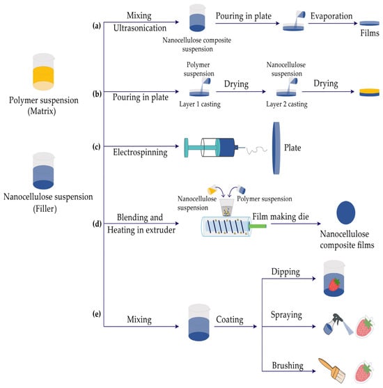 Preparation methods of nanocellulose composite films: (a) solvent casting method, (b) layer-by-layer assembly, (c) electrospinning, (d) melt process, (e) coating (adapted from [] with permission of Talyor & Francis).