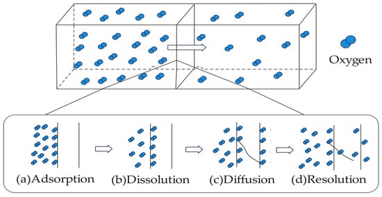 Regarding food preservation, oxygen concentration has a notable impact on food quality, which may induce oxidation, browning, and rancidity. Therefore, maintaining a hypoxic condition helps to extend the shelf life of food. Theoretical research shows that the gas permeation process through membrane materials includes four steps: adsorption, dissolution, diffusion, and resolution [,]. The permeation process of oxygen is illustrated in Figure 5. Also, oxygen diffusion varies across different types of nanocellulose due to their unique morphological properties. According to Lu Wang et al. [], if CNCs are added as a filling material into another polymer matrix, its uniform and rigidly stratified structure will result in fewer gaps in films, increasing the porosity and making the gas diffusion more tortuous, as shown in Figure 6a. When CNF is incorporated with other polymers, its high aspect ratio will form a twist network structure, resulting in a more tortuous diffusion path, as shown in Figure 6b.
