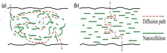 (a) Gas diffusion path of CNF; (b) gas diffusion path of CNCs through composite films (adapted from [] with permission of ELSEVIER).