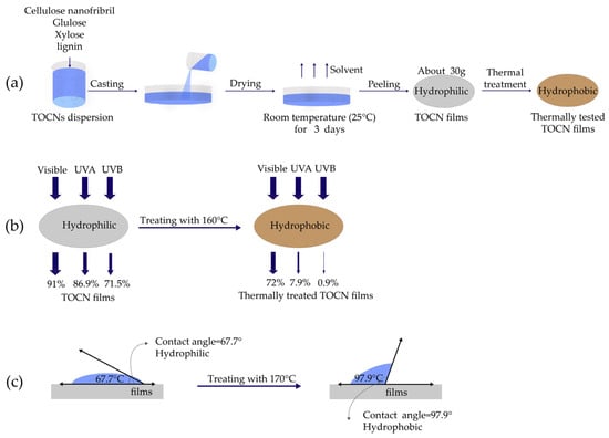 (a) Preparation of TOCN UV-blocking films; (b) performance changes in thermally treated TOCN films; (c) contact angles of water droplets (adapted from [] with the permission of ELSEVIER).