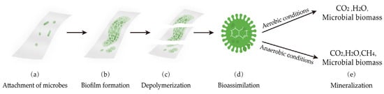 Biodegradability refers to the fact that some materials can be degraded by microorganisms under natural or composting conditions and ultimately mineralize into carbon dioxide (CO2) and/or methane (CH4), H2O, and inorganic salts. Generally, the biodegradation of polymer products can be summarized into five major phases [], which are schematically shown in Figure 8: (a) the attachment of microbes, gathering of microbes, and adherence to the surface of the polymer; (b) biofilm formation followed by changes in physical and chemical properties along with the increasing attachment of microbes; (c) depolymerization: microbes secrete extracellular enzymes and exopolysaccharides which can fragment the polymer degradation into oligomers, dimers and monomers; (d) bio-assimilation: the decomposed polymer is absorbed and utilized by microbes; (e) mineralization: polymers completely degrade into CO2, H2O, and microbial biomass under aerobic conditions, while under anaerobic conditions, they degrade into CO2, H2O, CH4, and microbial biomass.