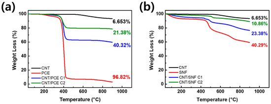 A centrifuge was utilized to separate the dispersing agent that had effective interaction with CNTs from the portion that had poor interaction within the CNT:SNF and CNT:PCE dispersion at a ratio of 1:2. During the centrifugation process, the dispersing agents that interacted with the CNTs settled and formed a precipitate, while those that did not adhere to the CNTs remained dissolved in the supernatant. The TGA results for the sediment formed during the centrifugation process enabled us to determine the percentage of polymer dispersing agent adhered to CNTs (Figure 2). CNTs experienced a weight loss of approximately 6.65% up to a temperature of 900 °C. In the case of PCE, roughly 96.82% of its weight was incinerated, while SNF underwent a loss of about 40.29%. The weight loss values of both CNTs and dispersants serve as the benchmark for determining the ratio, which was ascertainable by assessing the weight loss of the sediment after centrifugation. At the initial centrifuge step, CNT/PCE exhibited a weight loss of about 40.32%, followed by a subsequent weight reduction of 21.38% during the second centrifuge process. Additionally, for SNF, the initial procedure resulted in a 23.38% weight loss, with a subsequent 10.86% decrease in the second procedure. The specific ratio of polymer dispersing agents to CNT was determined by applying the provided equation, with the results obtained from TGA analysis.