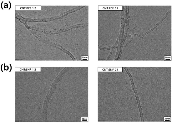 Figure 5 reveals the morphology of CNTs within the dispersing solution. FE-TEM images were utilized to compare the change in thickness of CNTs before and after centrifugation. The pristine CNTs have a thickness within the range of 10–13 nm. At a CNT:PCE ratio of 1:2, CNTs demonstrate a thickness ranging from 18 to 21 nm (Figure 5a and Figure S1 in the supplementary data). The excessive PCE dispersing agent adhering to the CNT surface led to a thicker diameter compared to the pristine CNTs. Moreover, PCE that has not adhered to the CNTs was present in the vicinity, forming a dot-like morphology [18]. After the centrifugation process, any excess PCE that has not reacted with the CNTs disappeared, resulting in a thickness that closely resembles that of the pristine CNTs (Figure 5a).