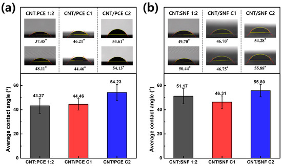 Since CNTs exhibit poor interfacial compatibility with cement [10], it is necessary to apply cement superplasticizers to enhance the compatibility at the interface between the CNT dispersion and cement. To assess the influence of PCE and SNF on the interfacial affinity between CNT and cement, a contact angle analysis was conducted.