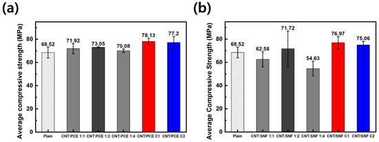 Compressive strength results of cement nanocomposites according to mixing ratio of CNT to dispersing agent (a) PCE and (b) SNF.