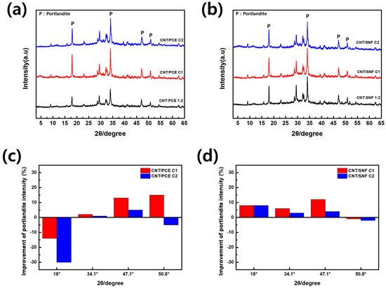 XRD analysis of cement nanocomposites with (a) CNT/PCE and (b) CNT/SNF and enhancement of C-S-H and portlandite peaks of cement nanocomposites with (c) CNT/PCE and (d) CNT/SNF C1 and C2 dispersion in comparison to those of the CNT:PCE 1:2 and CNT:SNF 1:2.