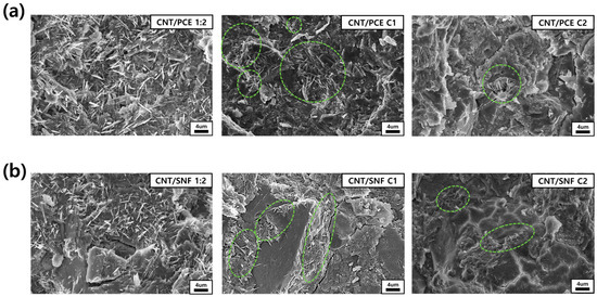 Figure 9 displays FE-SEM images illustrating the internal structure of the cement composites, where the degree of distribution of CNTs inside the cement was compared according to centrifugation treatment. The FE-SEM images of the cement nanocomposites with CNT/PCE 1:2 and CNT:SNF 1:2 dispersion reveal a homogeneous distribution of carbon nanotubes within the cement matrix. Specifically, the uniform distribution of CNTs was most pronounced when utilizing PCE as the dispersing agent. However, as the centrifugation process advances, there is a gradual decrease in the uniformity of CNT distribution. After a single round of centrifugation, it becomes apparent that CNTs tend to aggregate sporadically. Furthermore, when the centrifugation procedure was performed twice, CNT bundles tended to aggregate in specific areas, attributed to their limited dispersion capabilities, as observed in the OM images (Figure 3). However, considering that the majority of identified CNTs were located in close proximity to cracks within the cement structure, their presence may positively contribute to the enhancement of the strength of cement composites.