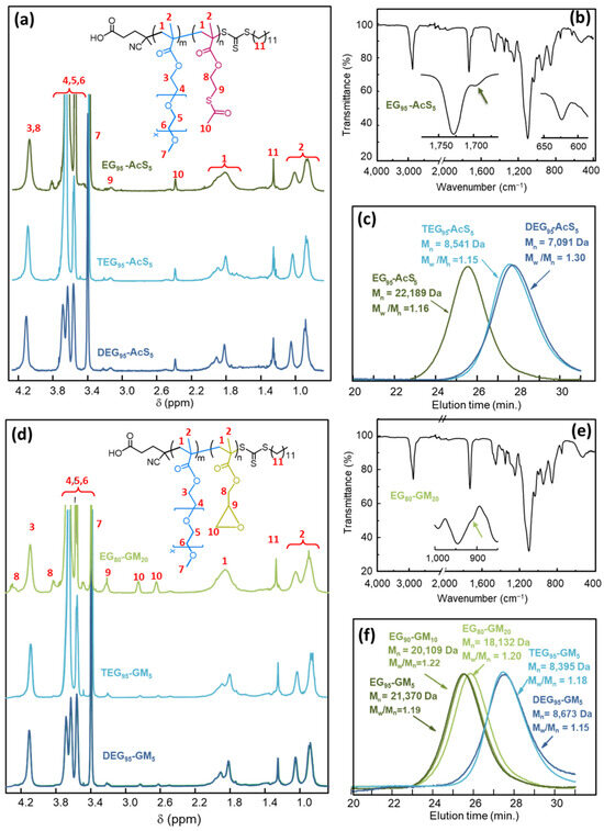 (a) 1H-NMR (b) FTIR and (c) SEC traces, corresponding to representative copolymers of oligoethylene glycol methacrylate (PEGMEMA = EG, MEO3MA = TEG, or MEO2MA = DEG) and AcSEMA (AcS). (d) 1H-NMR, (e) FTIR, and (f) SEC traces, corresponding to representative copolymers of oligoethylene glycol methacrylate (PEGMEMA = EG, MEO3MA = TEG, or MEO2MA = DEG) and GlyMA (GM).