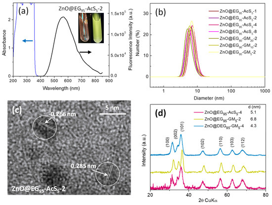 (a) Absorption and emission spectra (after excitation at 365 nm) corresponding to a sample synthesized in the presence of thiolated polymer (EG95-AcS5-2); (b) hydrodynamic diameter determined by Number (%) corresponding to ZnO QDs functionalized with copolymers bearing thiol or glycidyl groups; (c) TEM image corresponding to the ZnO@EG95-AcS5-2 hybrid, the distance between the lattice planes are indicated in the Figure; (d) XRD of some representative ZnO@polymer hybrids.