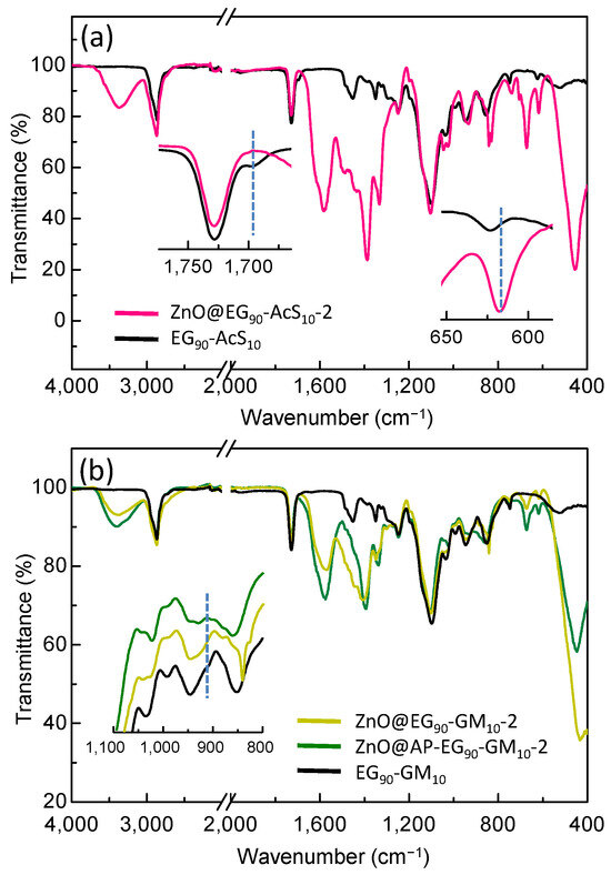 Comparative ATR-FTIR spectra analysis between (a) ZnO@-EG90-AcS10-2 QDs and the pristine EG90-AcS10 copolymer, and (b) ATR-FTIR spectra corresponding to ZnO@EG90-GM10-2 and ZnO@AP-EG90-GM10-2 QDs compared to the pristine EG90-GM10 copolymer.