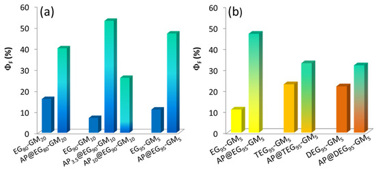 Fluorescence Quantum Yield (ΦF) of ZnO QDs in ethanol (a) comparing the use of copolymers of PEGMEMA (EG) with glycidyl groups with and without APTES; (b) comparing EG, DEG, and TEG in copolymers with glycidyl groups.