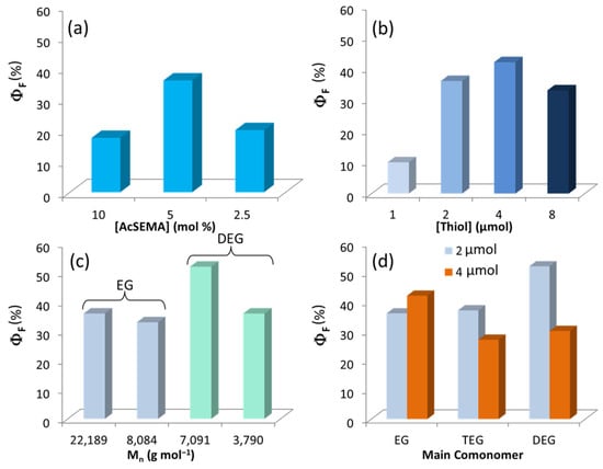 Fluorescence Quantum Yield (ΦF) of ZnO QDs in ethanol as a function of (a) AcSEMA mol (%) in the p(PEGMEMA-co-AcSEMA) copolymers; (b) thiol (µmol) content in the precursor solution; (c) Number molecular weight distribution (Mn) for p(PEGMEMA-co-AcSEMA) (EG-AcS) and p(MEO2MA-co-AcSEMA) (DEG-AcS) copolymers with 5 mol % of AcSEMA; and (d) type of ethylene glycol based comonomer: PEGMEMA (EG), MEO3MA (TEG), and MEO2MA (DEG).