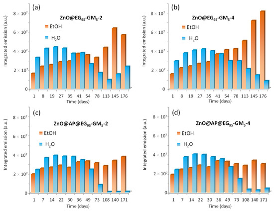 Evolution of the integrated fluorescence emission as a function of storage time for ZnO hybrids diluted 1:10 in ethanol and water synthesized in presence of (a) 2 µmol or (b) 4 µmol of GlyMA in the EG95-GM5 copolymer. Impact of APTES in combination with (c) 2 µmol and (d) 4 µmol of GlyMA in the EG95-GM5 copolymer.