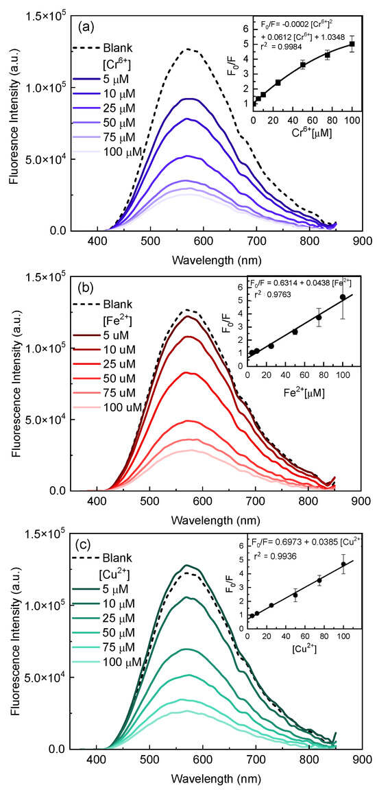 Decrease in fluorescence emission of ZnO@EG95-AcS5-2 as a function of metal concentration (5–100 μM) and in the insert the corresponding Stern–Volmer plot: (a) Cr6+; (b) Fe2+, and (c) Cu2+.