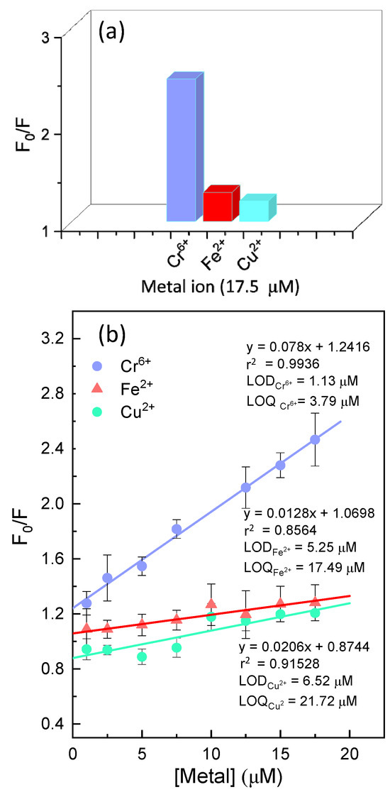 Previous research has demonstrated the potential of utilizing the loss of fluorescence from ZnO QDs in the presence of specific metals as sensors for detecting these analytes in water [4,5,27,28]. Specifically, a reduction in fluorescence has been observed when they are exposed to Cr6+, Cu2+, and Fe2+. Other authors have tested β-cyclodextrin-capped ZnO QDs as a fluorescent probe for detecting Co2+ [4]. Detecting metals such as copper and chromium in water is of the utmost importance due to their potential environmental and health impacts. Copper, while essential in trace amounts for human health, can become toxic at elevated levels, causing adverse effects on aquatic life and ecosystems. Chromium, especially in its hexavalent form, is a known carcinogen and possesses significant health risks to humans and animals when present in drinking water. Regular monitoring and accurate detection of these metals help ensure water quality complies with regulatory standards, safeguard public health, and enable timely remediation actions to protect the environment and prevent potential long-term consequences.