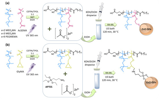 Synthesis of functional statistical copolymers by Photo-RAFT using CDTPA RAFT agent and TPOL photoinitiator in ethanol medium under 365 nm UV light. (a) Copolymers with thioacetate groups are used alone as templates for the synthesis of ZnO QDs, whereas (b) copolymers with epoxy groups are combined with APTES. Under the basic medium of the reaction, the thioacetate releases a thiol group with avidity for the ZnO QD surface and the epoxy group reacts with the amine of the silane on the ZnO QD surface.