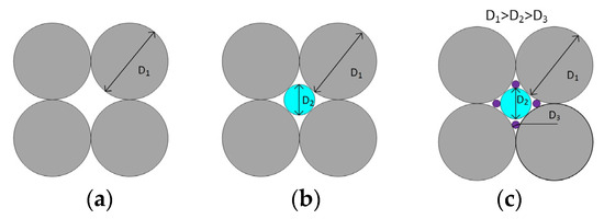 The main way to increase the content of solid particles above the limits indicated in Table 1 is to switch from monodisperse particles to polydisperse ones by adjusting their particle size distribution. This approach is illustrated in Figure 1, which shows how smaller particles fill the voids formed between larger particles. The general theory of volume filling using polydisperse particles was considered in a number of works (e.g., [24]). It was noted that the limiting degree of filling to some extent depends on the viscosity of the medium in which the solid particles are placed [25]. The solution of the specific problem of increasing the limiting degree of volume filling is based on the following rather obvious considerations.