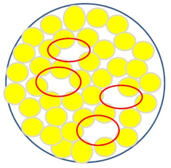 Empty spaces (shown as red ovals) when the volume is randomly filled using spherical particles.
