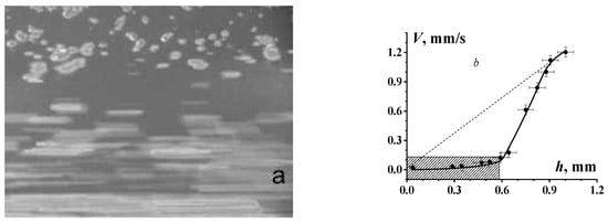 Considering rheological (as well as any others) properties implies that we are dealing with a homogeneous medium and the measured properties refer to any points in its volume or we have the right to average these properties over a chosen volume. This is correct for a wide range of concentrations but becomes unacceptable in dense suspensions due to the formation of clusters discussed in Section 3. These clusters begin to act as independent units and displacement occurs along their boundaries. The initial stage of this phenomenon is the appearance of an inhomogeneous concentration profile across the direction of flow. This is seen in Figure 8 where one can see the excess concentration of solid particles (served as markers) near the wall and the movement of separate particles in the central part of the flow. The liquid is moving in the horizontal direction due to the movement of the bounding surface (see details in [78]).