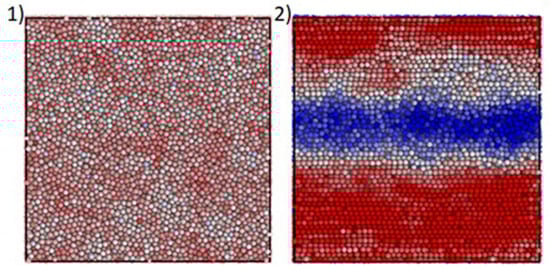 The shear-induced formation of a central low-concentrated layer (transition from the homogeneous suspension (1) to a stratified structure (2) Different colors correspond to various concentrations—blue 48%, red 58% [47] (with permission).
