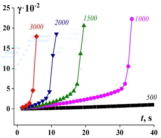 Development of deformation over time for 55% suspension at different given shear stresses (torques) measured on a rotational rheometer. Stresses (in Pa) are shown at the curves [99].