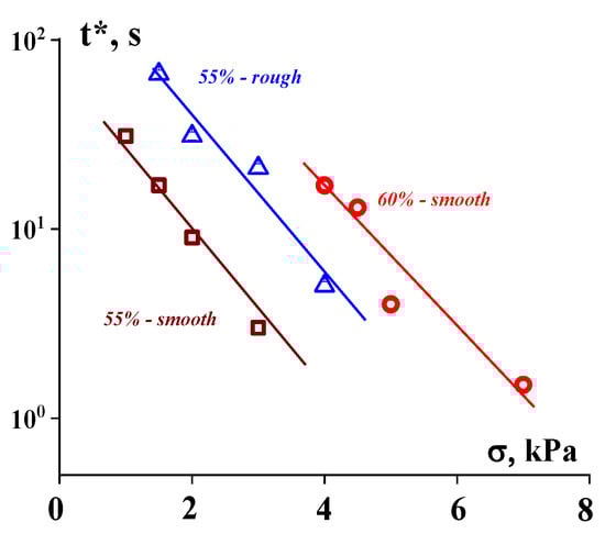 The strength of the suspension/surface contact is characterized by a certain durability (lifetime), t*, at which a jump in shear rate is observed. This point depends on the stress that is typical for different materials (Figure 12).