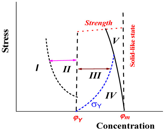 Meanwhile, two sub-regions should be distinguished within these two regions, in which the rheological properties of the suspension are significantly different. So, in the region φ < φ*, one can distinguish a range of very low concentrations, in which the dependence of viscosity on concentration is linear, and regions of higher concentrations, at which, when representing the dependence, it turns out to be necessary to take into account nonlinear effects (for any analytical description of this dependence). This limiting concentration of linearity can be estimated based, for example, on the well-known expression in the form of a quadratic function. Different coefficients at the quadratic term have been proposed, and a typical value is close to 5.0 [35].