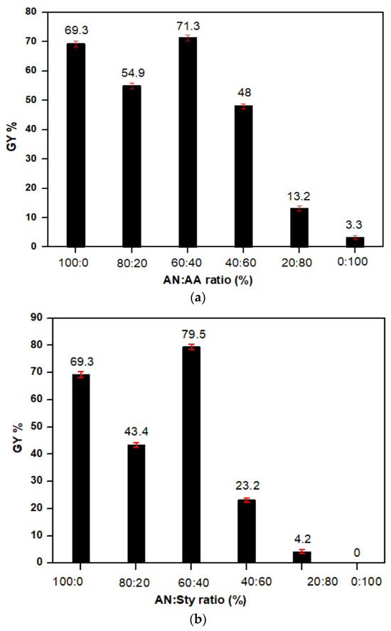 In the case of AN/AA and AN/Sty mixtures, as shown in Figure 1a,b, grafting of AA on the cellulose is very low. However, in the case of the mixture, the percent graft yield (GY%) increases with increasing the ratio of AN up to 60% from the total monomer percentage (10%). This is attributed to the higher reactivity of AN over that of AA and Sty, and thereby leading to less free radical sites on the monomeric units, and hence, a decreased graft yield has been shown by decreasing the percentage of AN. As a result, GY% depends on the monomer ratio in the initial mixture and on their concentration as well as shown in Table 1.