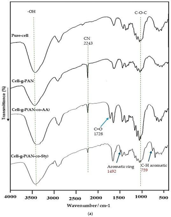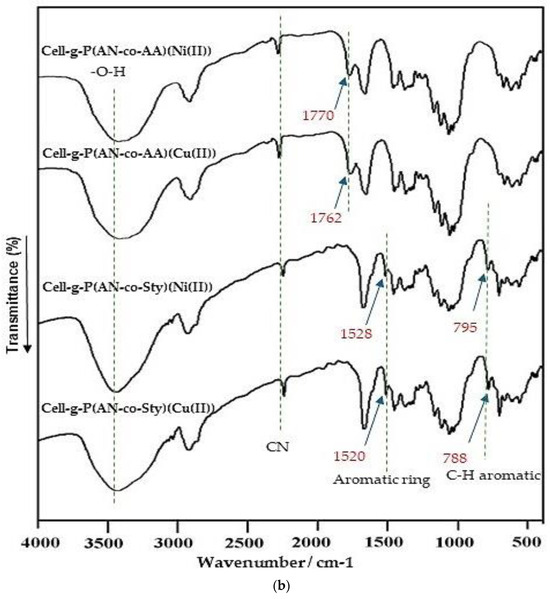 Figure 3 shows the IR spectra of pure-cell, cell-g-PAN, C-g-P(AN-co-AA), and C-g-P(AN-co-Sty). The FTIR Spectra of all grafted cellulose samples showed the typical characteristic peaks of cellulose. The absorption peaks around 3360 cm−1 were related to the hydroxyl groups (–OH) and the band at 2905 cm−1 was attributed to C–H stretching vibration. Other bands at 1430 cm−1 and 1050 cm−1 correspond to the –CH2 bending vibration and C–O–C stretching vibration in the glucopyranose ring, respectively. In the IR spectrum of Cell-g-PAN, the band at 2243 cm−1 was assigned to the nitrile group (CN). Compared with the IR spectrum of Cell-g-PAN, the IR spectra of cellulose graft poly(acrylonitrile-co-acrylic acid) has shown an additional absorption band at 1728 cm−1 due to the carbonyl group (C=O) of acrylic acid (Figure 3). Moreover, another absorption band at 2243 cm−1 was observed due to CN group of acrylonitrile in comparison to pure cellulose. The distinctive peaks of cellulose include a strong and broad band at 3500–3000 cm−1, which represents the O–H bond from AA. Hence, this supplied evidence for the grafting of both monomers onto cellulose. In the IR spectrum of Cell-g-P(AN-co-Sty), the peak at 889 cm−1 was related to C–H aromatic group of Sty, as well as bands at 1492 cm−1 and 3150–2850 cm−1 range, corresponding to the aromatic ring mode and aromatic C–H/CH2 stretching of polystyrene. According to these results, AN, AA, and Sty successfully introduced pure cellulose by the graft-copolymerization using KMnO4/citric acid redox system. Figure 3b represents IR of C-g-P(AN-co-AA) and Cell-g-P(AN-co-Sty) after adsorption of Ni(II) and Cu(II) ions. The peak of C=O group in Cell-g-p(AN-co-AA) exhibited low intensity and shifted to 1770 and 1762 cm−1, due to the formation of complexes with Ni(II) and Cu(II) metal ions [37,65]. Furthermore, the peaks of C-H aromatic group and aromatic ring in Cell-g-P(AN-co-Sty) shifted to1528 and795 cm−1 after adsorption of Ni(II), respectively, and also shifted to 795 and 788 cm−1 after adsorption of Cu(II) ions, respectively. In addition, the peaks related to CN slightly shifted to 2462 and 2458 cm−1 in Cell-g-P(AN-co-AA) and Cell-g-P(AN-co-Sty), respectively. This strongly supports the coordination between Cell-g-P(AN-co-AA), Cell-g-P(AA-co-Sty), and heavy metal ions, which suggests that carboxylic group and aromatic rings are involved in the adsorption of the heavy metal ions from the aqueous medium.