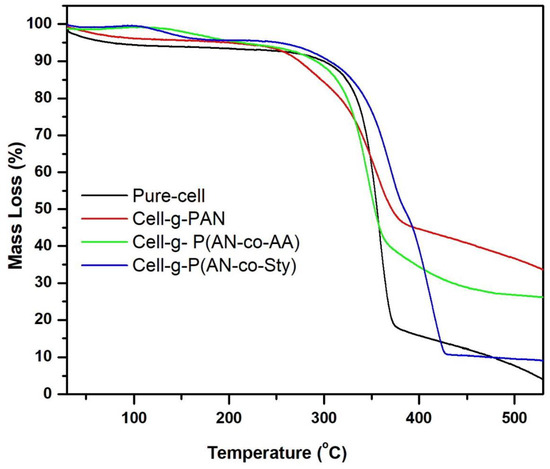 Thermal characterization and degradation of cellulose and its grafted samples with AN and mixture of monomers were studied by TGA as shown in Table 2 and Figure 5. TGA of pure cellulose showed 6% of weight loss at up to 100 °C, which represents the water desorption stage. In addition, this peak was observed in cell-g-PAN with 4% weight loss. The difference between pure cellulose and cell-g-PAN is attributed to the presence of the hydrophobic PAN chain polymer. In the decomposition stage from 250 °C to 370 °C, there is a difference between TG of cellulose and TG of cell-g-PAN in cellulose. At 250–300 °C, there is about 10% weight loss in the grafted samples which is comparable to thermal decomposition of PAN [58]. In the range 300–370 °C, a sharp weight loss was observed in pure cellulose with 78% and in cell-g-PAN with 36%, which can be referred to depolymerization of cellulose backbone chain through the degradation of glycosidic bonds (C–O–C) with the decomposition of the grafted chain. The final decomposition temperature was observed at 530 °C with 2% residue left in pure cellulose and 33% in cell-g-PAN.