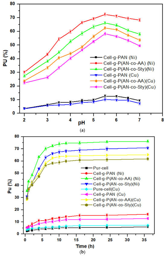 Pure cellulose, Cell-g-P(AN-co-AA), and Cell-g-P(AN-co-Sty) with higher percent graft yield were examined as adsorbents to evaluate their optimum adsorption efficiencies towards Ni(II) and Cu(II) at 30 °C and 8 h. Firstly, the pH of the solution medium was examined in the range of 2.0–6.5 to determine the most suitable one for metal adsorption. The pH value strongly affects metal ions adsorption, precipitation, and charge surface of the adsorbent samples, as shown in Figure 7a. With increasing the pH of the medium, the sorption of Ni(II) and Cu(II) metal ions proportionally increases up to pH 5.5 with cell-g-p(AN-co-AA) and cell-g-P(AN-co-Sty). The low adsorption efficiency of metals ions at a pH lower than 4.0 can be ascribed to the competitive behavior of the adsorption of metal ions and hydronium ions (H3O+) for the same adsorption sites of the copolymers. Additionally, the metal ions were found as hydroxides when the initial pH was higher than 6.0, which caused turbid solutions and interfered with other parallel studies. As a result, the pH of medium for the other adsorption experimental tests with factors was carried out at pH 5.5.