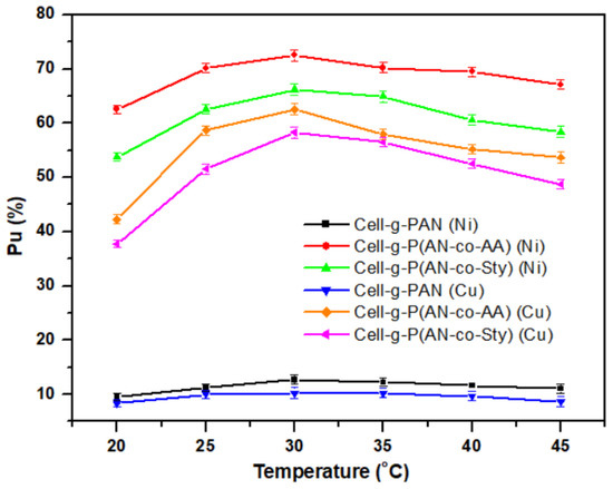 Temperature effect on the metal ion adsorption was examined within the range of 20–45 °C (Figure 8). The adsorption efficiencies of Ni(II) and Cu(II) ions increase with increasing medium temperature till 30 °C, then decrease with further increases in temperature. The lower adsorption ratio of metal ions onto the adsorbents may be attributed to the slower diffusion rate of the metal ions and the fast desorption rate compared with the adsorption rate.
