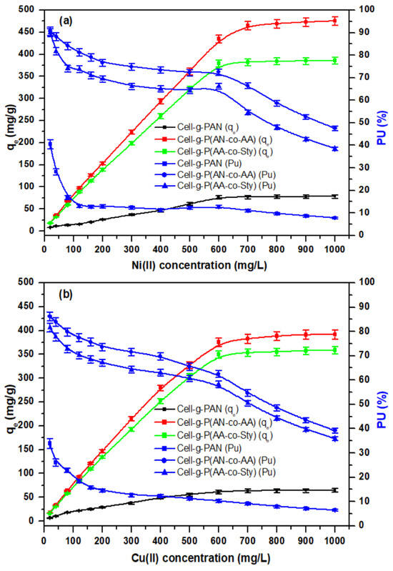 To study the effect of metal ion concentration, the adsorption rate and percent uptake were recorded with pure cellulose, Cell-g-PAN, Cell-g-P(AN-co-AA), and Cell-g-P(AN-co-Sty) with initial metal ion concentration in the range 20–1000 mg/L at the optimized adsorption conditions of pH 5.5, 8 h contact time, and temperature of 30 °C, as shown in Figure 9a,b. The amount of Ni(II) and Cu(II) ions uptake by Cell-g-PAN and Cell-g-P(AN-co-Sty) was increased with metal ion concentration till 600 mg/L. In the case of Cell-g-P(AN-co-AA), the adsorption efficiency of Ni(II) reached equilibrium at concentration 700 mg/L. Adsorption ratios decrease with metal ion concentration, and the adsorption capacity is constant after 700 mg/L of initial concentration, which indicated that the active sites on graft copolymer becomes lower and there are no sufficient active adsorption sites on the adsorbents to remove higher number of the metal ions. In Figure 9b, cellulose graft copolymer derivatives show the same behavior in the Cu(II) ion adsorption, but lower than adsorption behavior towards Ni(II) ions. Cell-g-P(AN-co-Sty) and Cell-g-P(AN-co-AA) adsorb about 5- and 6-times adsorption amount compared to Cell-g-PAN. The adsorption capacities of Cell-g-PAN for Ni(II) and Cu(II) at the initial metal concentration 600 mg/L were 76.2 mg/g (Pu of 12.7% Pu) and 61.56 mg/g (Pu of 10.26%), respectively. Also, at 600 mg/L initial metal ion concentration, adsorption capacities of Cell-g-P(AN-co-AA) for Ni(II) and Cu(II) were 435.07 mg/g (Pu of 72.51%) and 375.48 mg/g (Pu of 62.58%), respectively. On the other hand, the adsorption efficiencies of Cell-g-P(AN-co-Sty) for Ni(II) and Cu(II) were 379.2 mg/g (Pu of 66.2%) and 349.68 mg/g (Pu of 58.28%), respectively.
