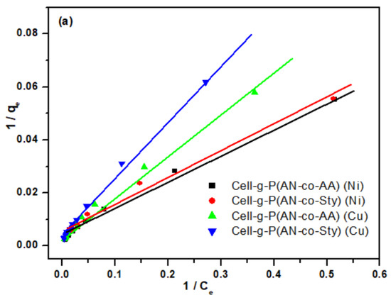 In order to explain the adsorption behavior and mechanism of Cell-g-P(AN-co-AA) and Cell-g-P(AN-co-Sty) towards Ni(II) and Cu(II) metal ions, the linear forms of Freundlich and Langmuir adsorption isotherm were applied. Their related parameters were determined for Ni(II) and Cu(II) metal ions with concentration range 20–600 mg/L at the optimized adsorption conditions (Figure 10a,b). The Freundlich model was frequently used to characterize the surface’s inhomogeneity. According to the Langmuir model, adsorption takes place at the adsorbent’s outside interface. The homogenous adsorbent surface and equivalent adsorbent sites were postulated by the Langmuir adsorption isotherm model [68]. As a result, the adsorbate monolayer forms on the adsorbent surface. The following equations represent the Freundlich and Langmuir models [69].