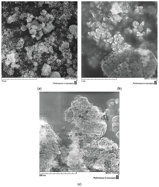 The structure of ND nanoparticles was studied by scanning electron microscopy (SEM). Primary nanodiamond particles have a complex structure, close to spherical, as shown in Figure 1. They are a giant molecule in which the carbon part is represented by a diamond core surrounded by a damaged carbon shell which is associated with a layer of surface functional groups localized on the uncompensated valences of surface carbon atoms. The presence of a large number of polar groups in the surface layer of nanodiamonds determines their complex of colloidal chemical properties and also leads to significant agglomeration of particles with the formation of aggregates of 500–1000 nm in size, and it is evident that individual particles have nanosize of 10–50 nm [,,].