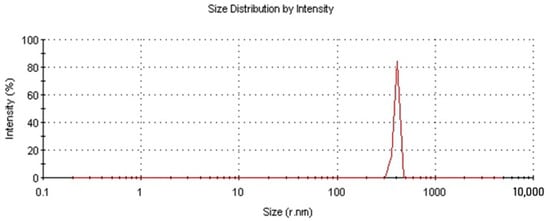 To determine the average particle size of NDs, the method of laser diffraction in the aqueous solution was used. Figure 2 shows that the size of the pristine nanodiamonds ranged from 300 to 500 nm, with more than 70% of the particles being ~400 nm in size. Using the method of low-temperature nitrogen adsorption, the active surface area of ND was measured to be 292 m2/g.