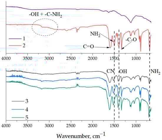 FT-IR spectroscopy of pristine NDs, aminoacetic acid, and ND samples treated with aminoacetic acid: 1—pristine NDs; 2—aminoacetic acid; 3—ND samples treated with 2.5% aminoacetic acid solution; 4—ND samples treated with 5.0% aminoacetic acid solution; 5—ND samples treated with 7.5% aminoacetic acid solution.