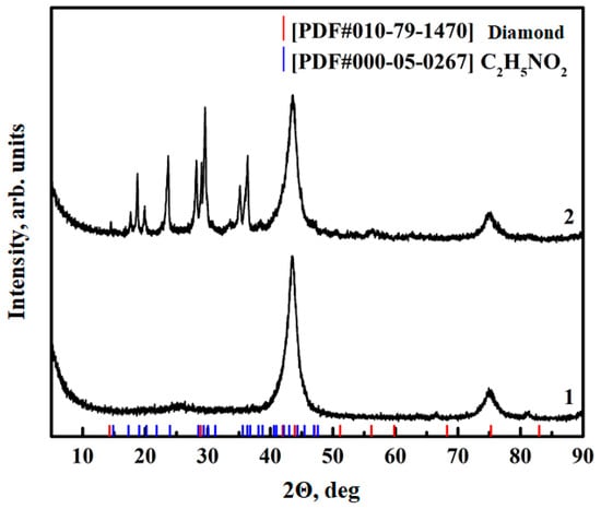 The presence of functional groups on the ND surface was further confirmed using X-ray diffraction analysis. The XRD diffraction patterns of the pristine NDs, Figure 4, show 43° and 76° (2θ) peaks standard for this material, which are attributable to the diffractions of 111 and 220 planes of a diamond crystal. As a result of the functionalization, the formation of new peaks related to aminoacetic acid was observed while maintaining the structure of NDs, Figure 4, curve 2, which confirms the success of the functionalization.