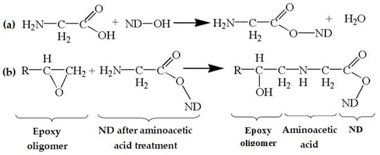Possible chemistry of the interaction of epoxy oligomer, aminoacetic acid, and ND: (a) interaction of aminoacetic acid with ND; (b) interaction of ND treated with aminoacetic acid with functional groups of epoxy oligomer.