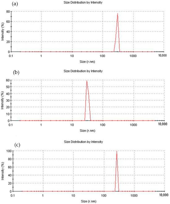 Fractional composition of ND particles modified with aminoacetic acid with different concentrations: (a) 2.5%; (b) 5%; (c) 7.5%.