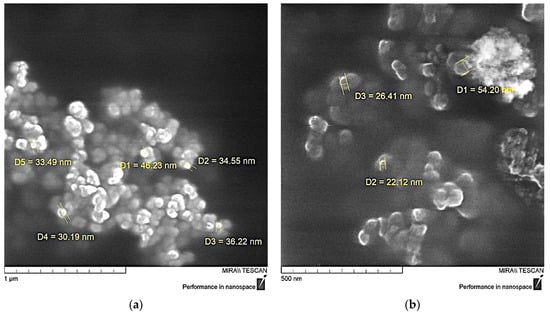 Measurement of the particle size of the functionalized NDs showed a significant decrease in their average size, Figure 7, which is likely due to the exfoliation of particles inside the aggregates under the influence of aminoacetic acid and preventing their further self-assembly. The optimal result was achieved when treated with a 5% solution of aminoacetic acid, as a result of which the particle size decreased to 25–40 nm, Figure 7b, which is also confirmed by SEM data, Figure 8. A further increase in the concentration of the aminoacetic acid solution is likely to lead to an increase in the surface interaction, thus resulting in an increase in the average particle size.