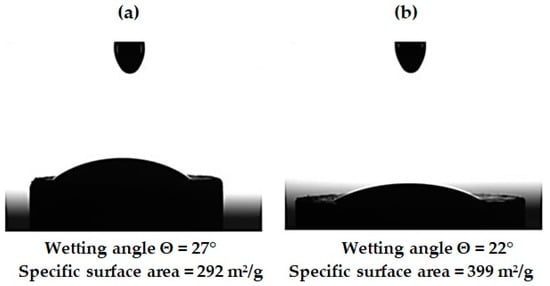Wetting angle and specific surface area of ND particles: (a) pristine ND; (b) after aminoacetic acid treatment.