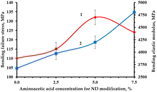 Dependence of bending stress (1) and modulus of elasticity in bending (2) of an epoxy composite containing 0.1 parts by mass of ND on the concentration of aminoacetic acid used to modify NDs.