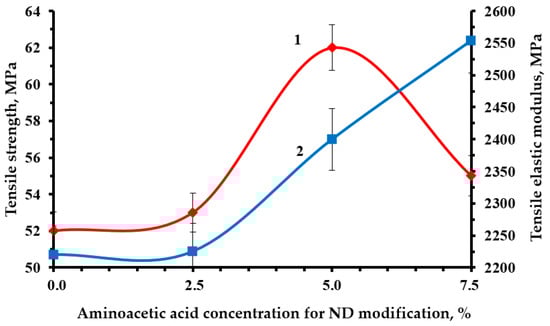 Dependence of the strength (1) and tensile modulus (2) of an epoxy composite containing 0.1 parts by mass of ND on the concentration of aminoacetic acid used to modify NDs.