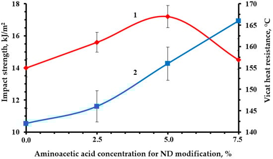 Dependence of impact strength (1) and Vicat heat resistance (2) of an epoxy composite containing 0.1 parts by mass of ND on the concentration of aminoacetic acid used to modify ND.