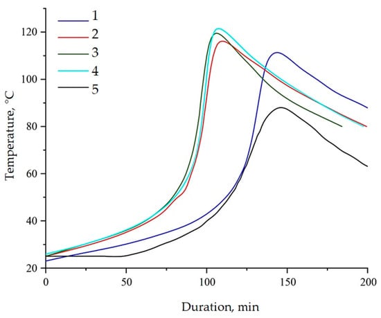Dependence of sample temperature over time during curing of epoxy compositions containing pristine and modified NDs: (1)—100 ED-20 + 40 TCPP + 0.1 ND + 15 PEPA; (2)—100 ED-20 + 40 TCPP + 0.1 ND(2.5% aminoacetic acid) + 15 PEPA; (3)—100 ED-20 + 40 TCPP + 0.1 ND(5.0% aminoacetic acid) + 15 PEPA; (4)—100 ED-20 + 40 TCPP + 0.1 ND(7.5% aminoacetic acid) + 15 PEPA; (5)—100 ED-20 + 40 TCPP + 15 PEPA.
