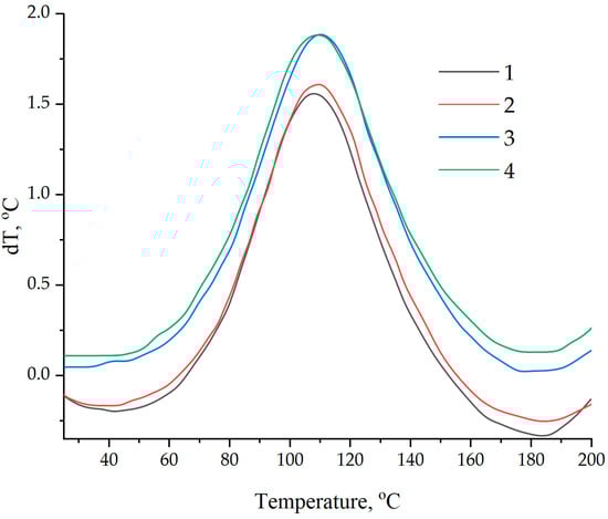 Differential scanning calorimetry of epoxy compositions: (1)—100 ED-20 + 40 TCPP + 0.1 ND + 15 PEPA; (2)—100 ED-20 + 40 TCPP + 0.1 ND(2.5% aminoacetic acid) + 15 PEPA; (3)—100 ED-20 + 40 TCPP + 0.1 ND(5.0% aminoacetic acid) + 15 PEPA; (4)—100 ED-20 + 40 TCPP + 0.1 ND(7.5% aminoacetic acid) + 15 PEPA.