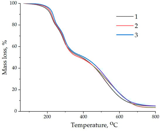 Data of thermogravimetric analysis of samples: (1)—100 ED-20 + 40 TCPP + 15 PEPA; (2)—100 ED-20 + 40 TCPP + 0.1 ND + 15 PEPA; (3)—100 ED-20 + 40 TCPP + 0.1 ND(5.0% aminoacetic acid) + 15 PEPA.